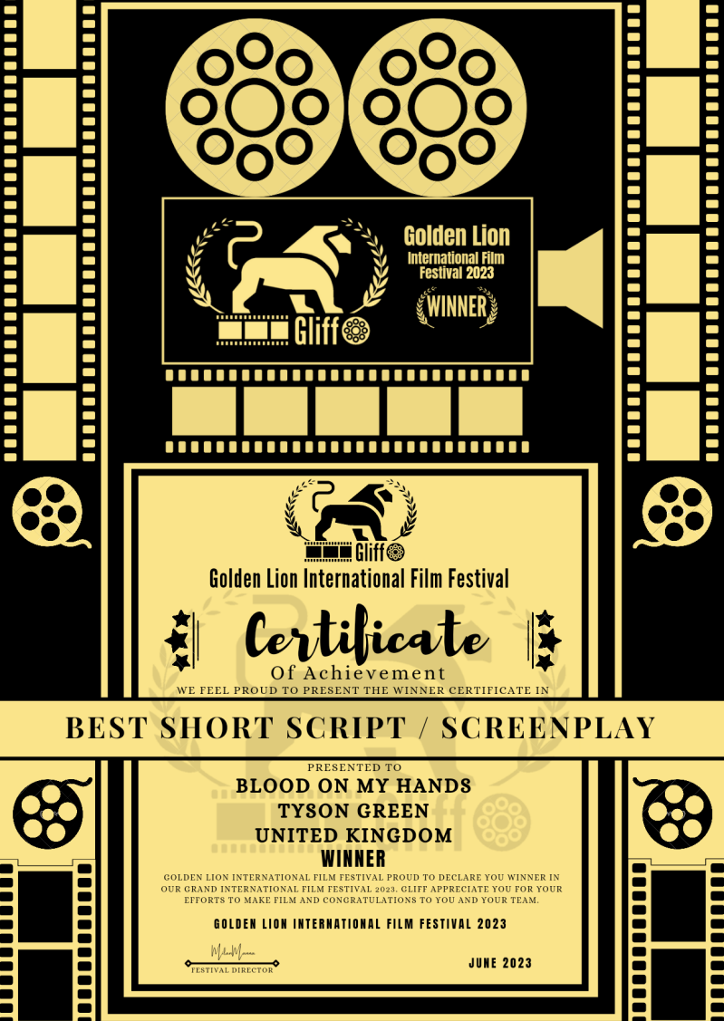 "Blood On My Hands" WINS 'BEST SHORT SCRIPT' at the Golden Lion International Film Festival.